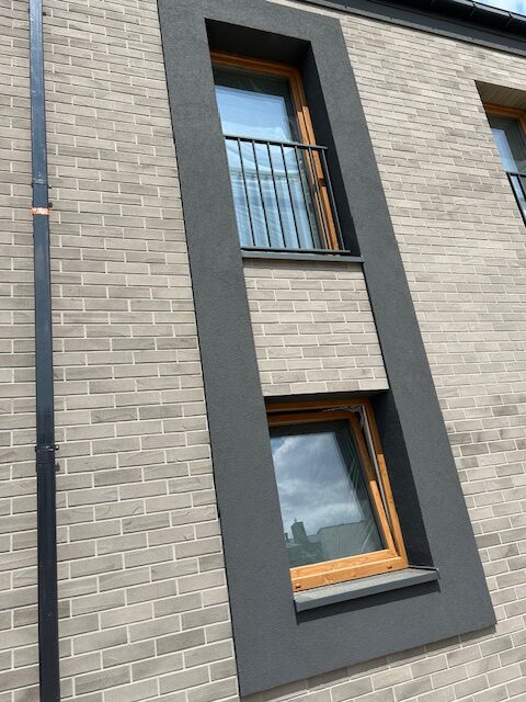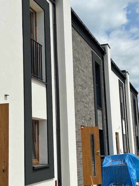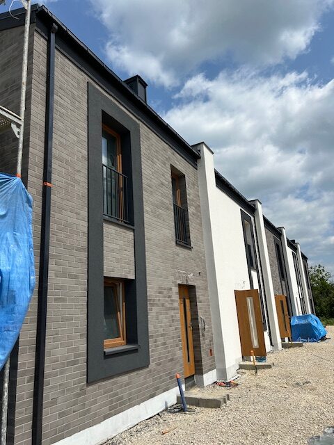 Elewacja frontowa szeregu pierwszego już prawie gotowa. W najbliższych dniach zamontowane zostaną daszki nad drzwiami wejściowymi do poszczególnych mieszkań. Jest ładnie, a będzie jeszcze a bardziej 🙂